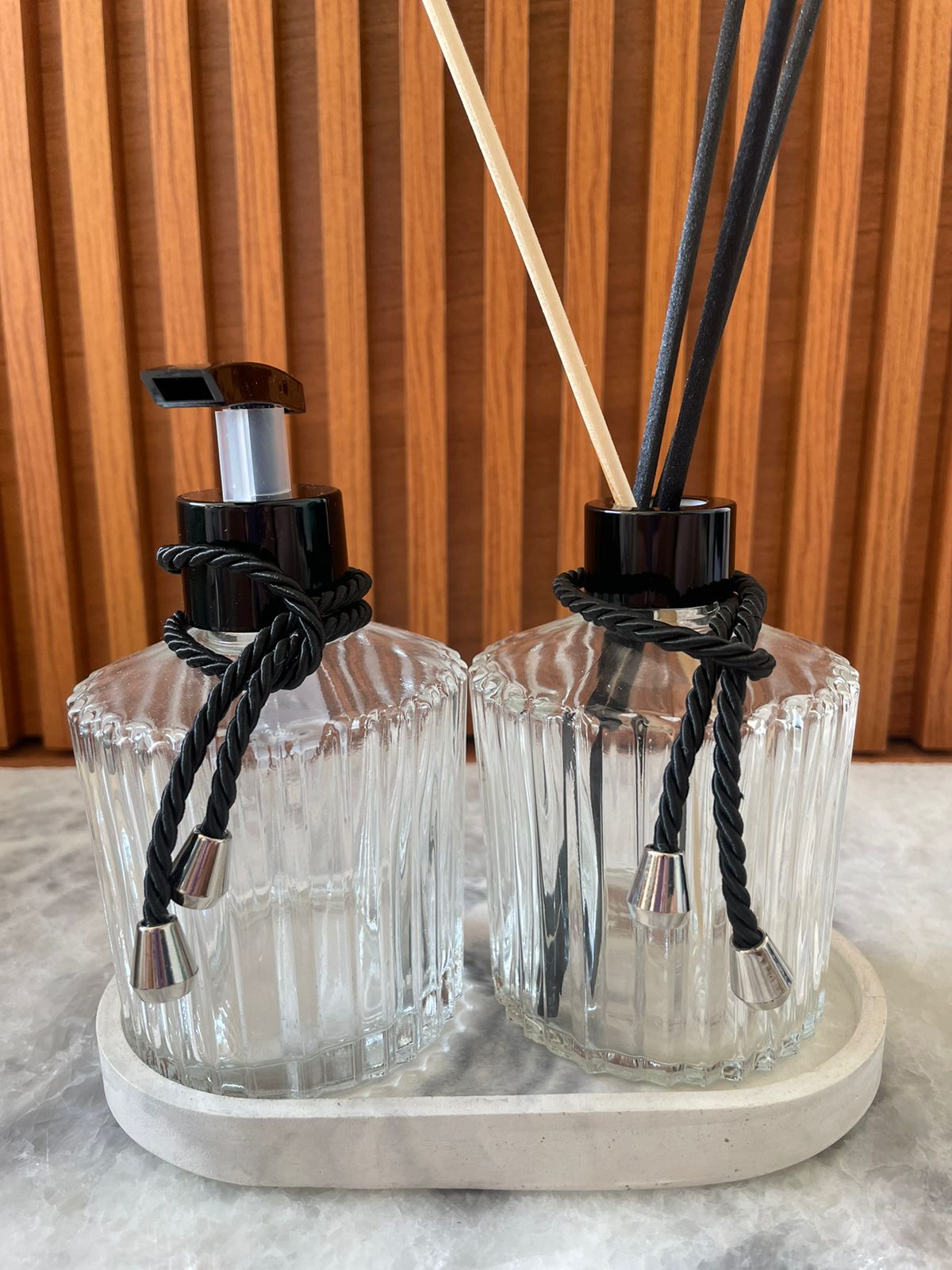 Delicadeza em Cada Detalhe: Kit Lavabo Com Frasco Em Vidro Canelado E Bandeja em Cimento Bia.
