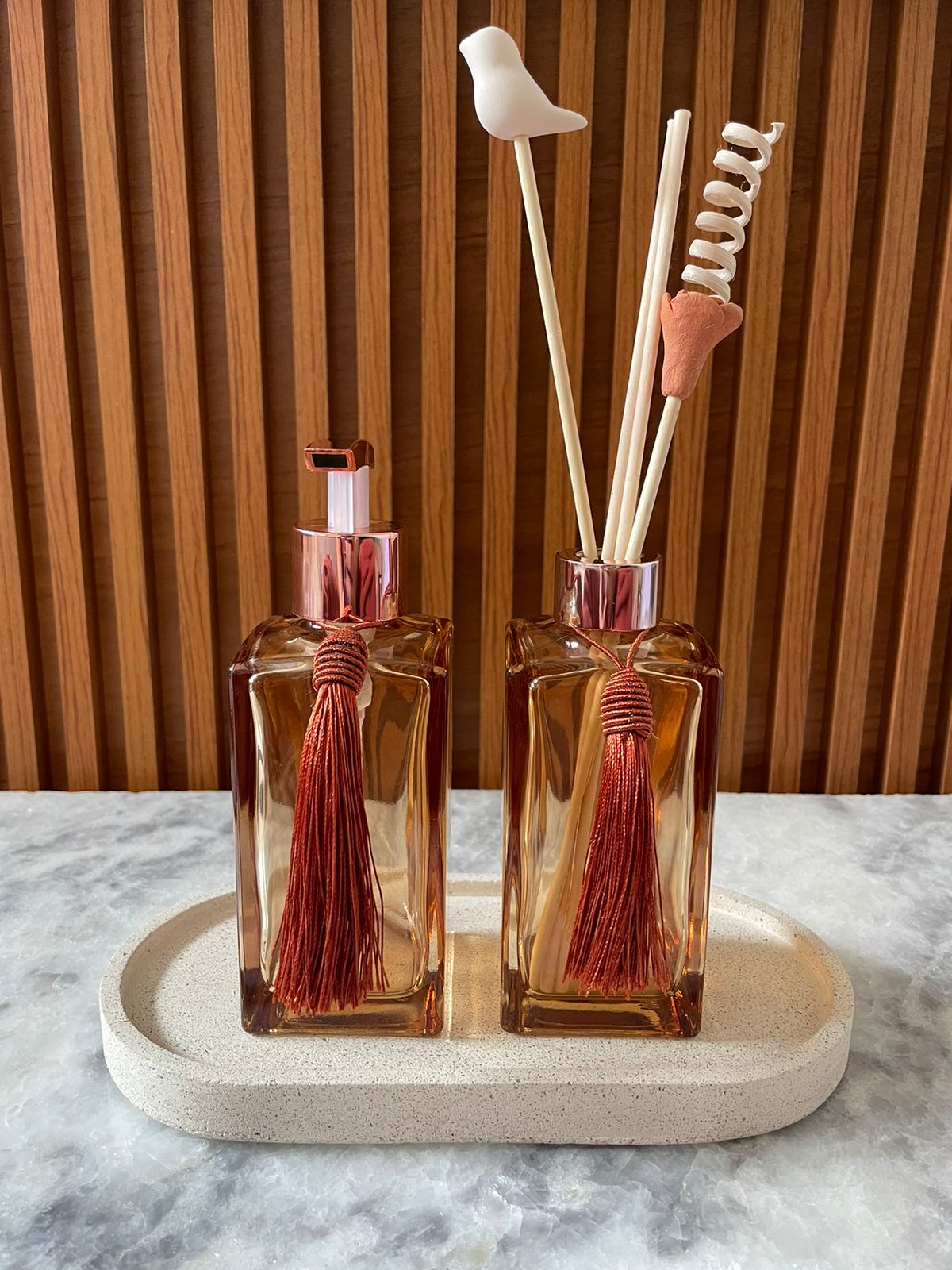 - Dois Frascos Funcionais: Um frasco para sabonete líquido e outro para difusor de ambientes. Ambos os frascos são feitos de vidro de alta qualidade e possuem um design elegante que combina com qualquer decoração.