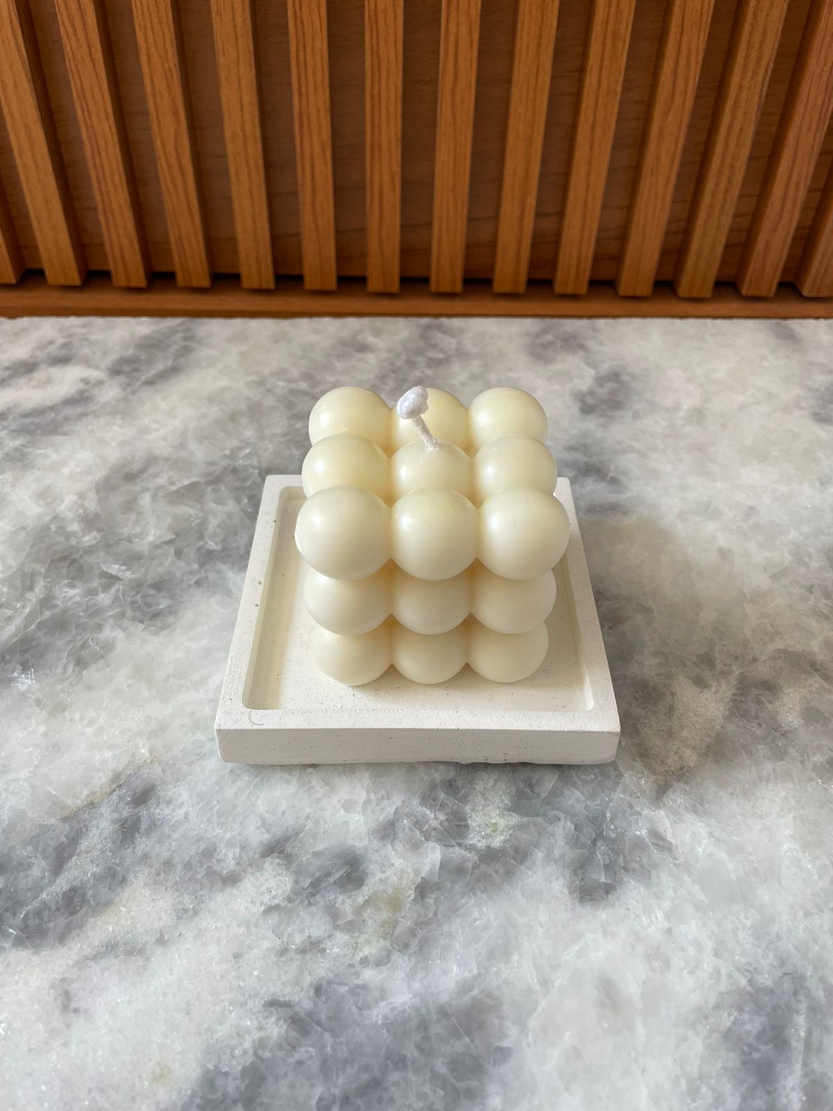 A bandeja e vela aromática da Bubble são peças artesanais de alta qualidade, cuidadosamente confeccionadas em concreto para oferecer uma estética moderna e elegante. Cada item é único, uma vez que o processo artesanal confere características individuais, tornando-os exclusivos.
